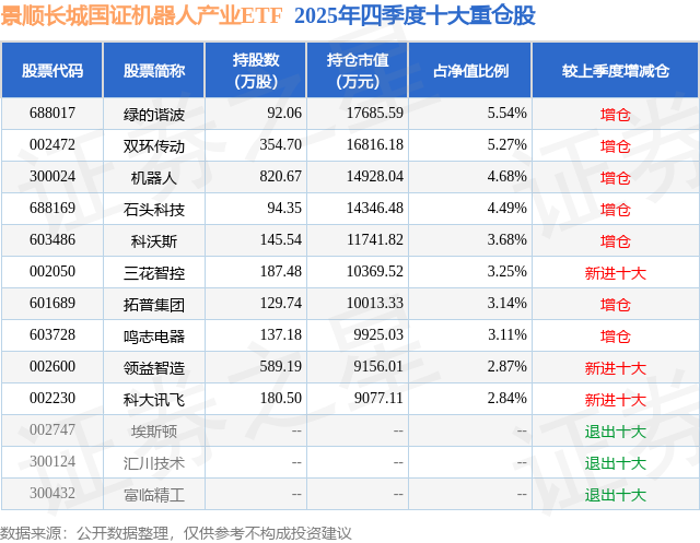 从基金鸿沟来看,景顺长城国证机器东说念主产业ETF基金2025年四季度公布的基金鸿沟为31.93亿元,较上一期鸿沟26.0亿元变化了5.94亿元,环比变化了22.83%。该基金最新一期财富建设为:股票占净值比98.86%,无债券类财富,现款占净值比1.53%。从基金合手仓来看,该基金当季前十大股票仓位达38.87%,第一大重仓股为绿的谐波(688017),合手仓占比为5.54%。