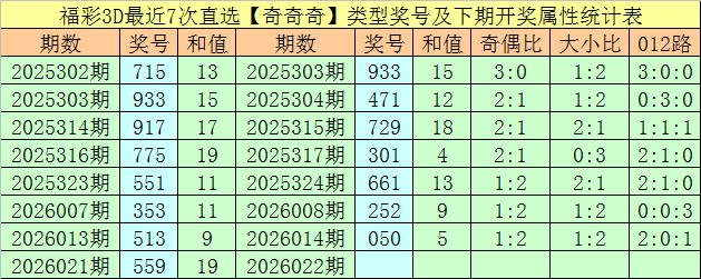 前7次出现奇奇奇类型奖号区别为:715、933、917、775、551、353、513,其下期区别开出奖号:933、471、729、301、661、252、050。